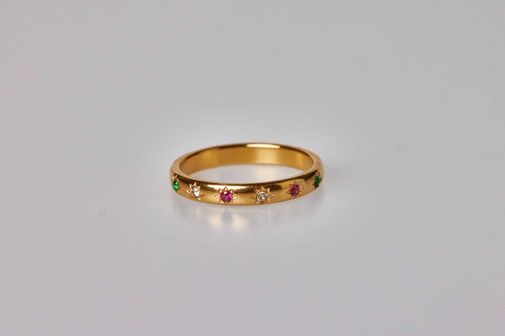 Embark on a cosmic journey with our Cosmic Ring—a captivating piece adorned with miniature suns in red, green, and white stones. This celestial-inspired ring adds a touch of otherworldly charm to your style, providing a versatile and colourful statement. Whether worn alone for a celestial focal point or paired with other rings, the Cosmic Ring radiates your unique style, bringing the magic of the universe to your fingertips.