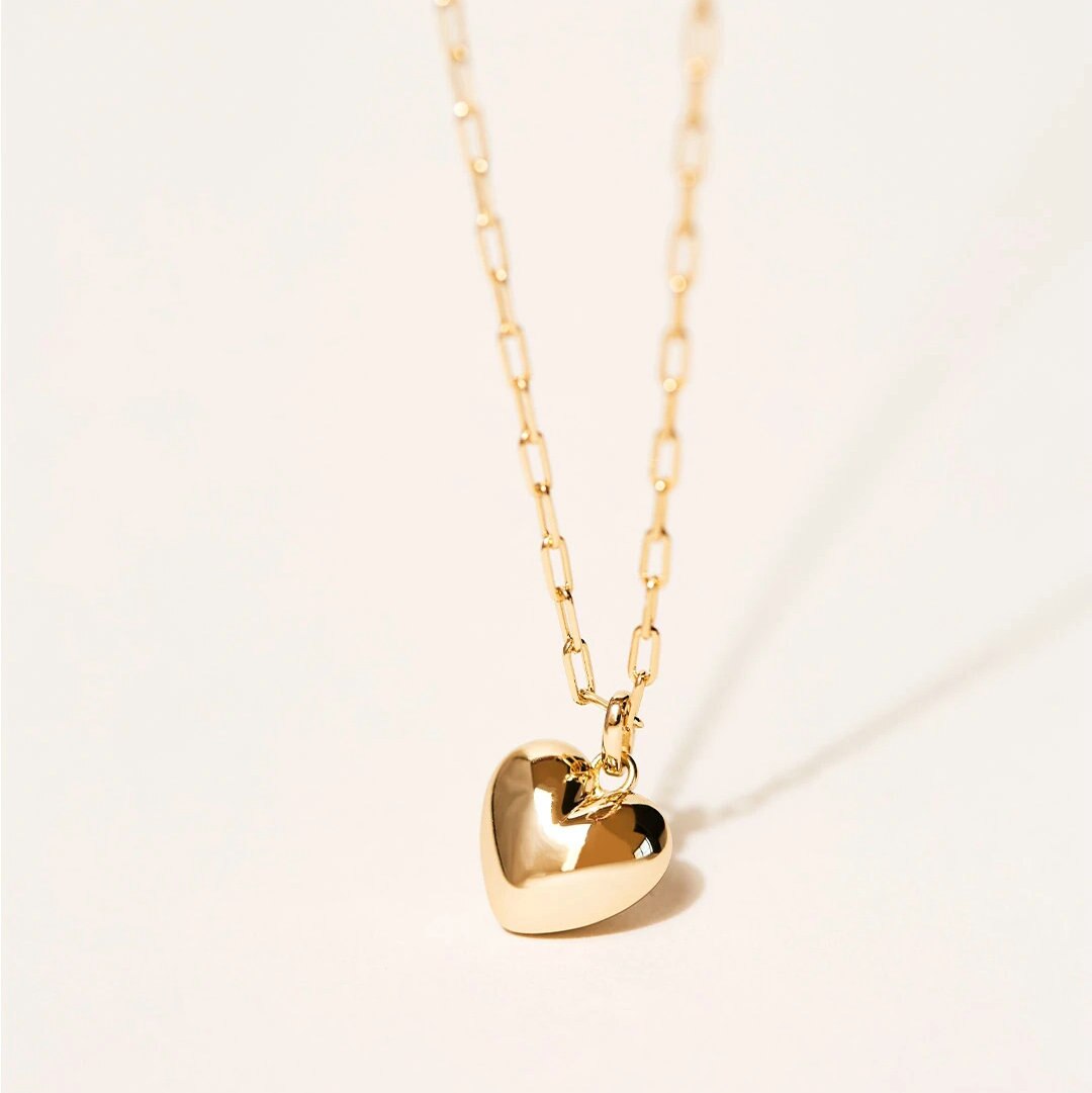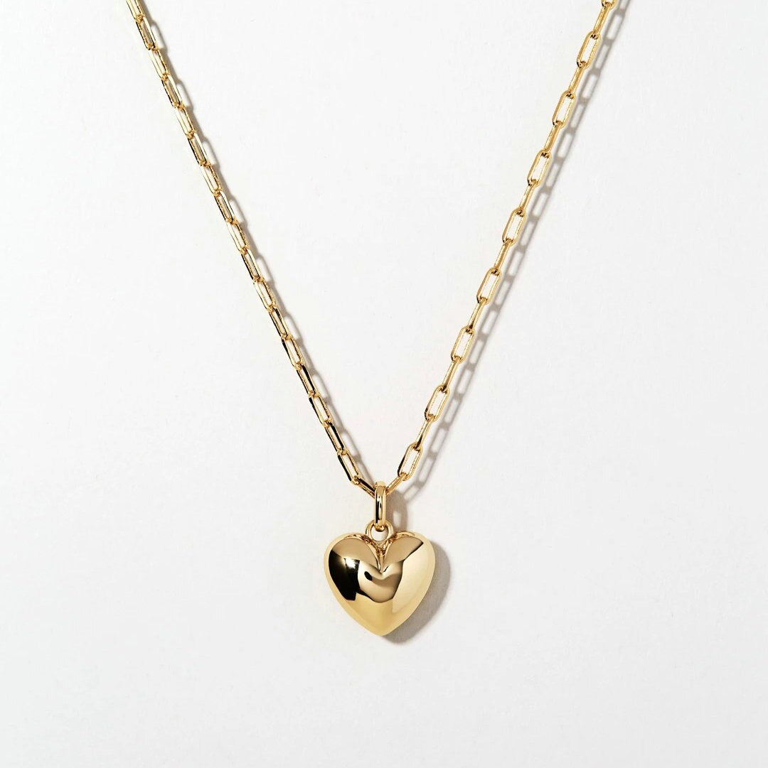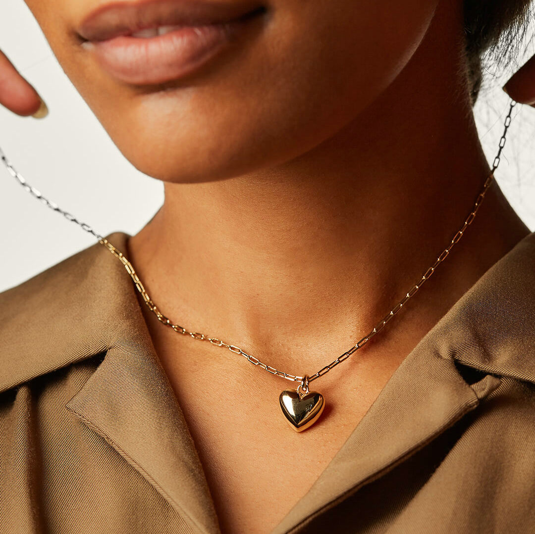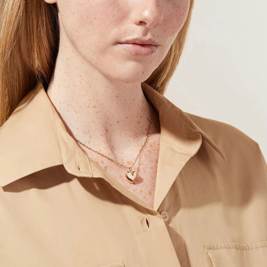 A heart-style necklace in radiant gold, symbolizing love and affection, gracefully adorns the neckline with its timeless and enchanting beauty.