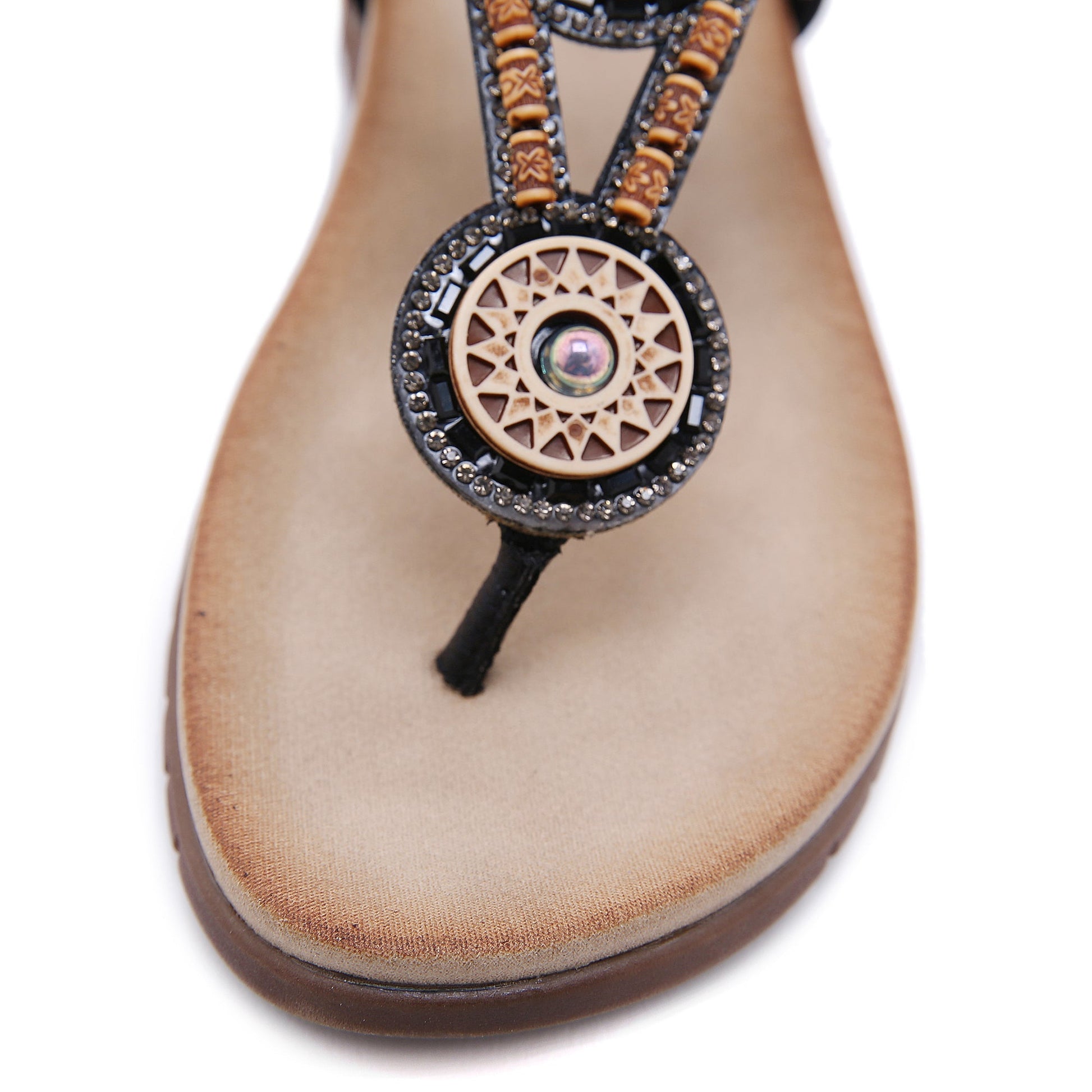 Add eye-catching detail to ensembles with the bold embellished straps of these comfort bed sandals featuring boho inspired design. An anti-skid lightweight sole provides ground-gripping traction.